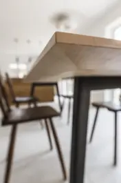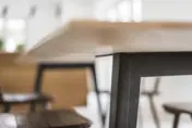 Eine Massivholzplatte, die viel aushält. Zwei aus Stahl gefaltete Beine, die all das im 11 Grad Winkel tragen. So stabil wie früher. Mindestens. Und so zeitlos, wie’s dem Zeitgeist entspricht. Auch in Zukunft.