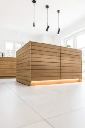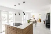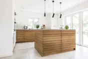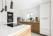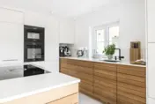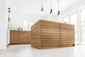 Geradlinig und puristisch – auch im Wortsinn: mattweiße Oberflächen und Fronten, prägnantes Design in den unterteilenden Eichenelementen. Letztere aus einer einzigen großen Platte geschnitten für harmonische Natürlichkeit. Und ja, Schubladen und Schränke sind vorhanden. Wo, das weiß unser Kunde. Und wir.