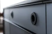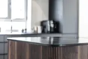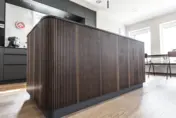 Eine reduzierte graue Rückwand als reiner Arbeitsbereich. Dafür ein umso präsenterer Küchenblock im Zentrum. Mit Nussbaum-Rippenstruktur so schlicht wie lebendig. Mit Granitarbeitsplatte so robust wie langlebig. Mit Lichtstäben von oben so dezent wie einladend. Praktisch zum Kochen, einladend zum Ratschen und dank der runden Ausführung gefahrlos für vorbei huschende Kinderköpfe – und sich länger mal anlehnende Erwachsenenhüften.